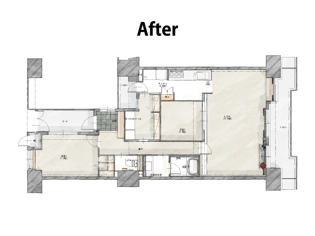 3LDK(85㎡) → 2LDK + walk-in closet、&キッチン・バスルーム・トイレの全面リフォームを、ほぼスケルトン・リフォームの形でお願いしました。契約前の幾度かの相談時、こちらの漠然とした希望をパターン別の図面に落とし込んで(イメージが掴めない場合にはパースも添えて)、概算見積りと共にスピーディに作成していただき、抱いていた大規模=高額なリフォームへの不安感を払拭してくれました。でも、まずは何よりも店長の方をはじめ、営業・設計・施工管理それぞれの担当の皆さんの、こちらの話を親身に聞いてくれる姿勢に信頼感を持てたことが、リフォームをお願いする大きな決め手になりましたね。施工に際しては、キッチンやバスルーム等の設備関係から、コンセントやスイッチのデザインや位置、壁紙やカーペットのデザイン、材質といった細部に至るまで、こちらの要望を元に「リフォームのプロ視点」+「居住者視点」でアドバイスをいただきました。また、こちらの細かい疑問についてもグループラインを通じて即応答をしていただき、そして施工中であっても、こちらの急な仕様変更希望に可能な限り柔軟に対応してもらえたのも、納得のいくリフォームに繋がりました。リフォームが完成して約1カ月が経ちましたが、お蔭様でストレスのない快適な生活を送らせてもらっています。ありがとうございました。