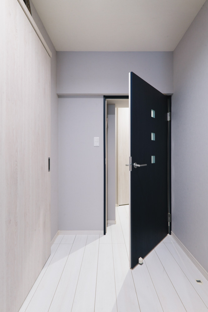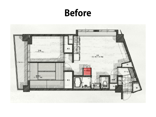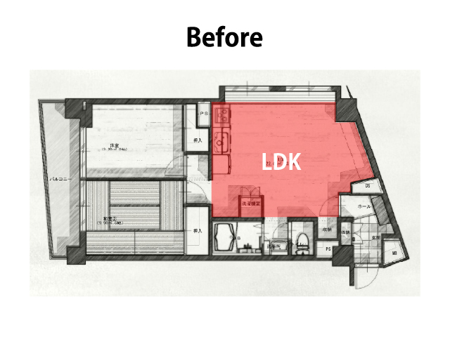 2LDKの間取り構成は変えることなく、限られた空間でLDKを広く確保するために、リビング空間をバルコニー側へ配置を変え、対面キッチンも実現しました。