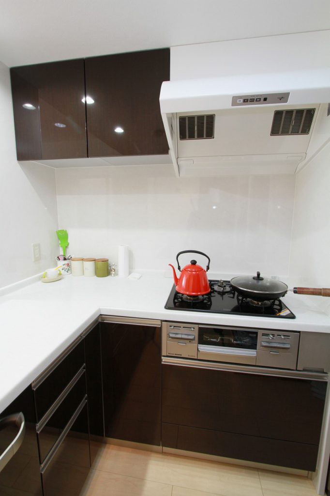 キッチンが閉鎖的で暗く、お子様の様子も見れないとのことでしたので、L型の対面キッチンに変更し、LDKに広がりのあるプランをご提案したところ、ご採用いただけました。既存の吊戸上部が使いきれていないようでしたので、収納力のあるシステムキッチンを採用し、吊戸棚をなくすことでより開放感が出ました。