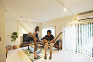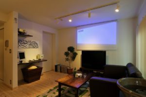 2部屋をつないだLDKには、オープンなL型キッチンやハンモック、ホームシアターを設置し、家族が仲良く楽しく暮らせる空間にしました。