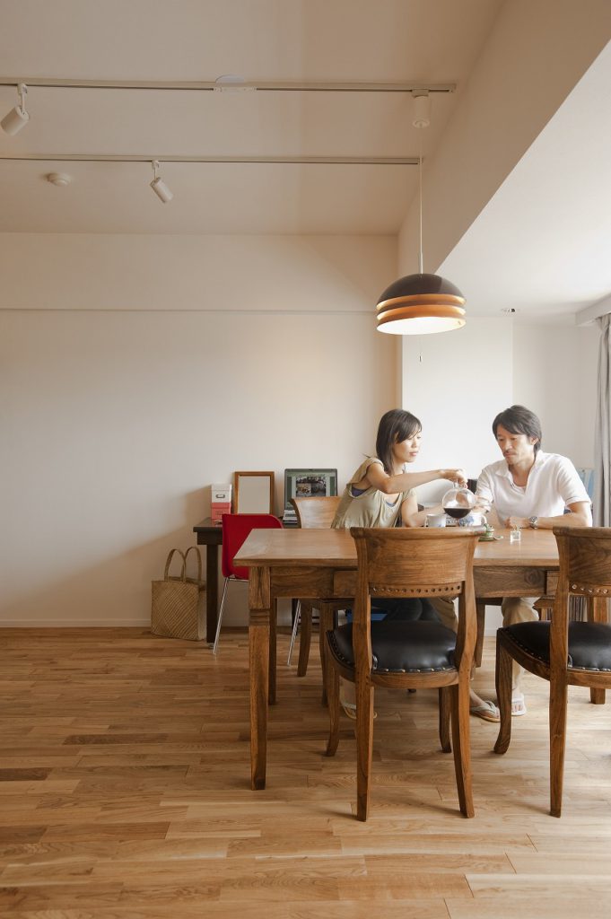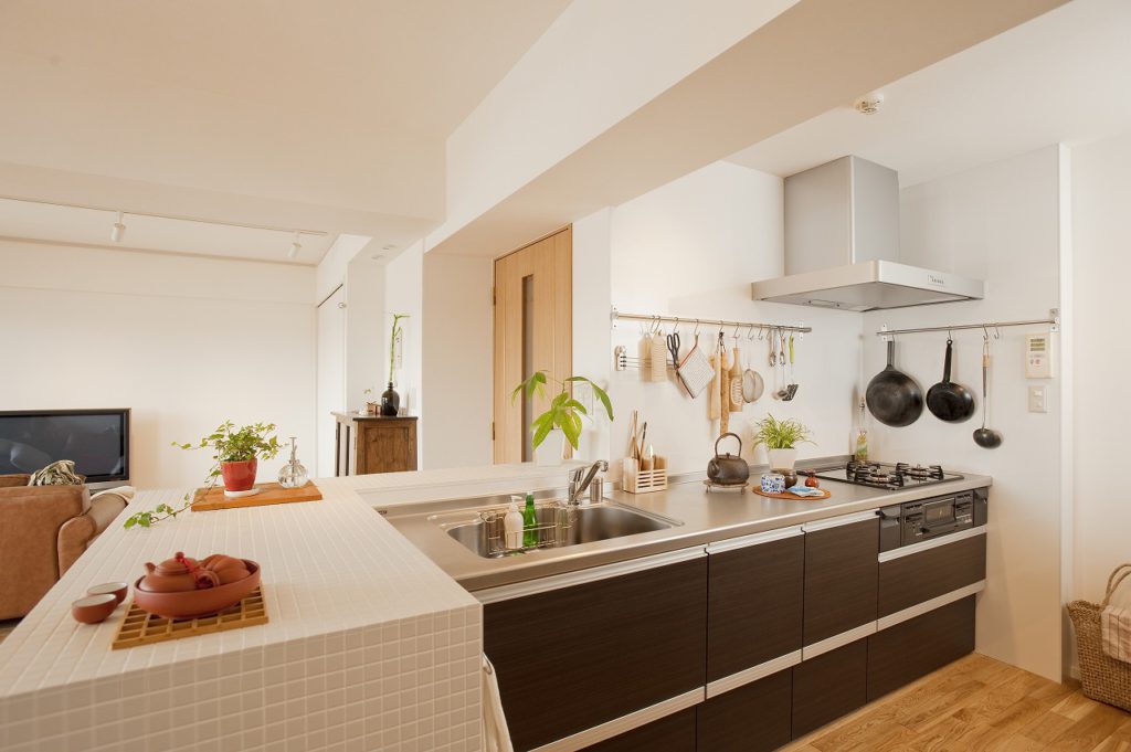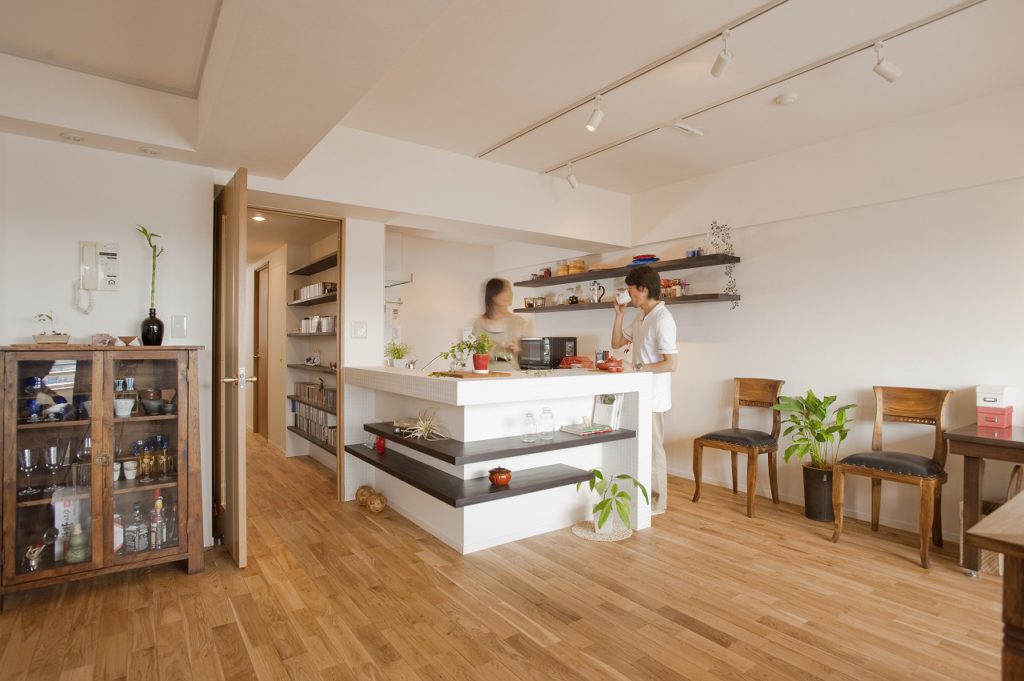 施主様のご予算をオーバーしないよう、O様の希望に優先順位をつけてご提案しました。まず、2部屋を一体化し広くしたLDKと、それに続く廊下には贅沢に無垢材を採用。壁付きのキッチンを、給排水管を大幅に付け替えない範囲で移動し、念願の対面式に。一方で、建具などは既存のものを活用してコストを抑えました。