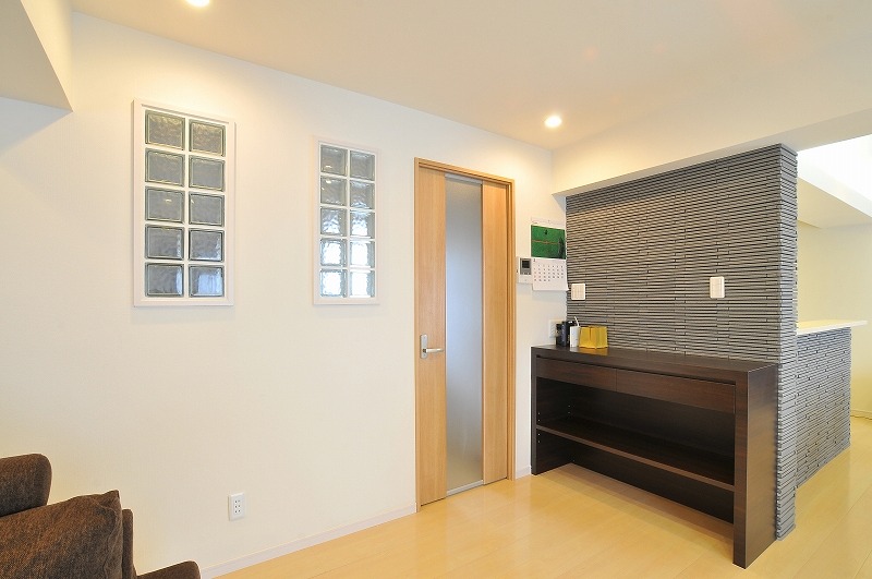 圧迫感を感じていた玄関は、オフホワイトで統一。ガラスブロック、間接フラットライトを採用して圧迫感を取り除くことが出来ました。