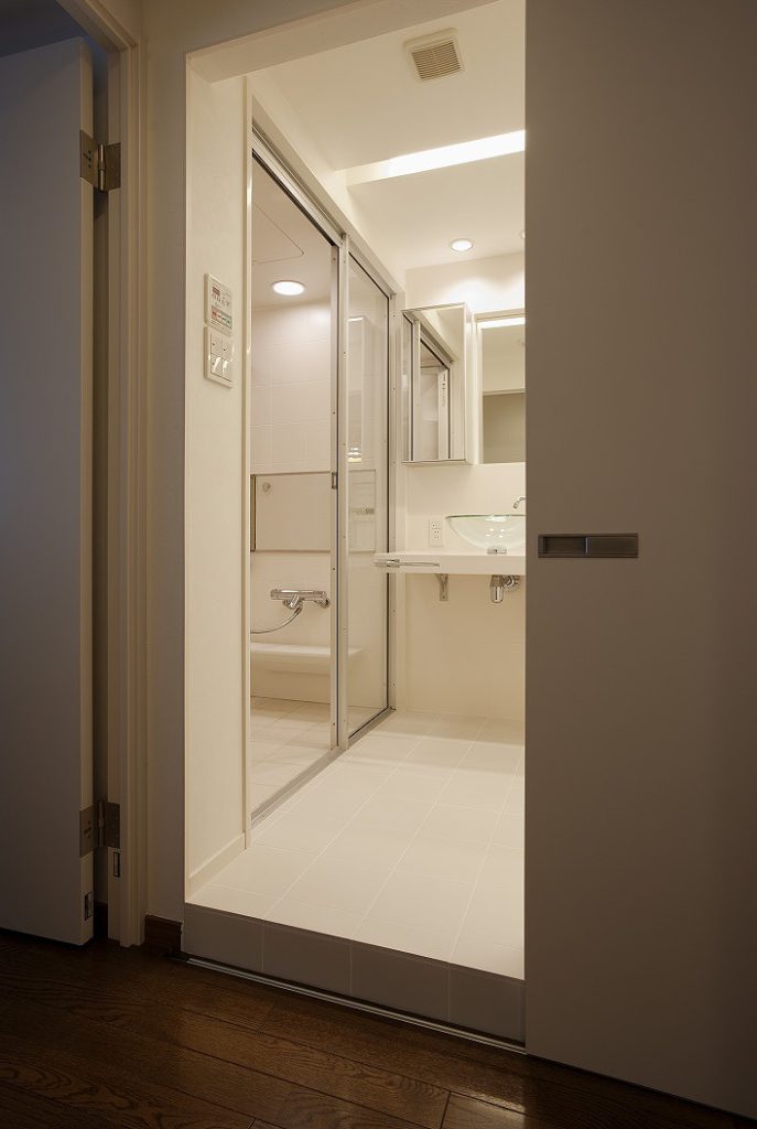 カラーはこだわって白一色。天井に入れた照明用のスリットや、浴室ミラー、洗面カウンターなどのラインをそろえて水平方向への広がりを演出しました。
