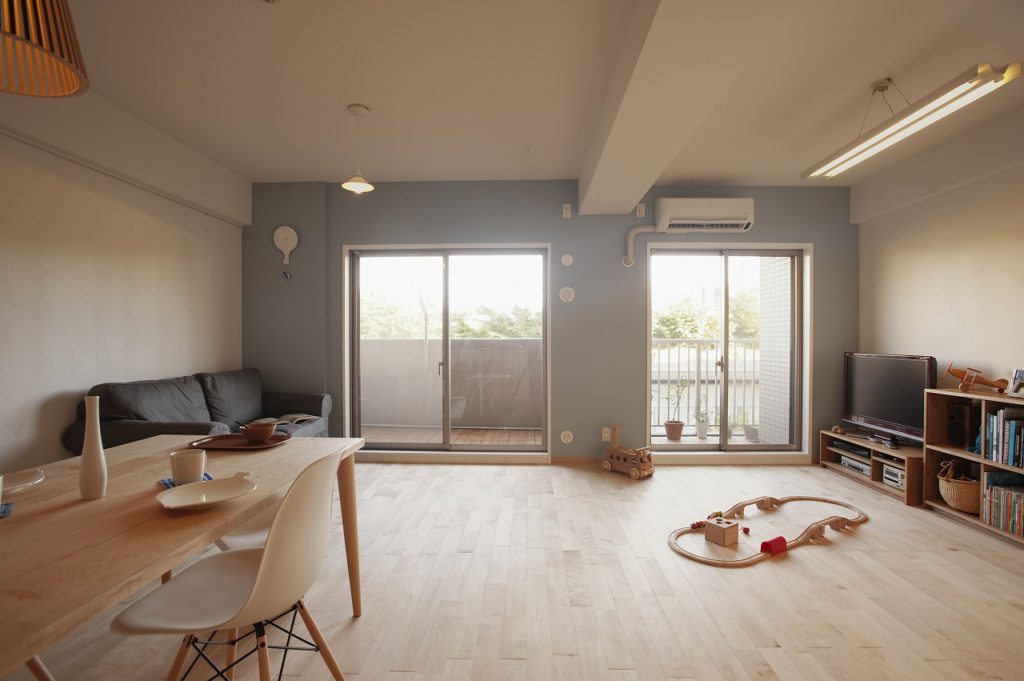 窓面壁に空色のクロスを全面に張ったことで、外と室内が繋がるイメージの広々とした空間のリフォームができました。