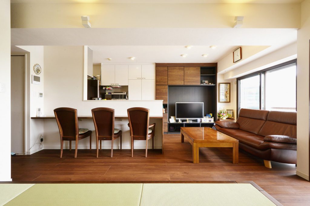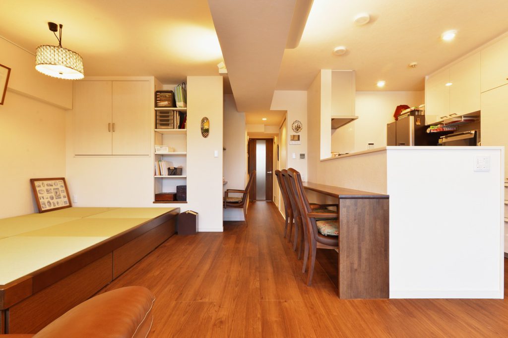 たくさんのお話を通して、お客様とプランナーが一緒に作り上げた理想のお住まい。壁を取り払うことでリビングには開放感が生まれ、梁には間接照明を配することで落ち着いた空間を作り出しています。以前は少なかった収納スペースにお困りでしたが、ウォークインクローゼットと各所に収納を設置することで、家具を減らしてすっきりとしたお部屋に仕上がりました。