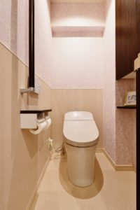 デザインイメージはお部屋ごとの変化を演出しています。例えば家族が集まるLDKはブラウンをアクセントにした落ち着きある空間に、水廻りは奥様が気持ちよく明るい気分で家事ができるようピンクを取り入れた空間に。個室となるご主人の寝室はベースカラーのべージュ×アクセントカラーのダークブラウンでシックなスペースへ、お嬢様のお部屋はおしゃれにかわいくまとめています。LDKはCGパースでイメージを共有し、配色のコーディネートを行いました。