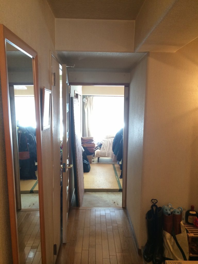 梁や段差、物も多く「洞窟のような家」そんな印象のお宅でした。お子様の独立を期にご夫婦2人でのお住まいをキレイにしたいと考え一番の不満は、明るい窓へ背中を向けたキッチン。収納も少なく雑多に、物が置かれている状況で、暗い奥まった場所での家事は気分が落ち込んだ様に感じられました。大好きな絵画も廊下や部屋の隅に追いやられ、飾ることもままならない状態で保管されていました。また、建具は全て180cmと低く、身長が高いご主人様と息子様は建具をくぐる様に通っていました。