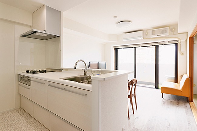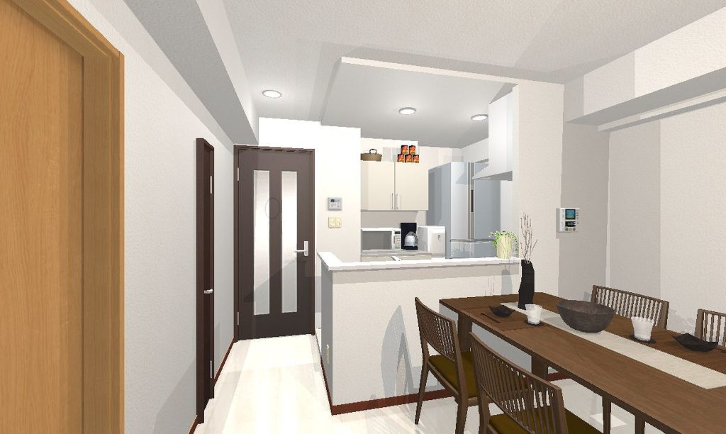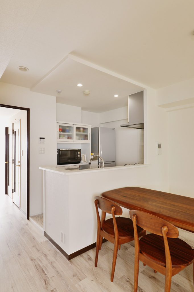 もともとカウンターを挟んだ開口部のある対面キッチンではありましたが、独立したキッチンスペースは閉塞感があり、吊戸棚の使い勝手の不便などを考えるとおもいきってオープンにしたい、というお客様の想いで始まったリフォームでした。