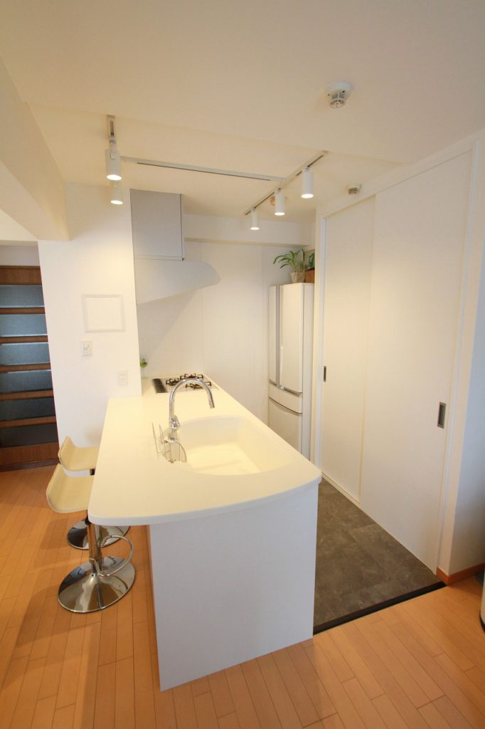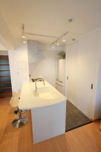 そこで、リビングに向く対面スタイルをご提案。フルフラットのカウンターなので、そこでお子様もスツールに座って本を読んだりおやつを食べたり・・・。ご夫婦にとってもお子様にとっても、お気に入りのスペースになりました。