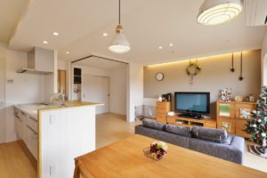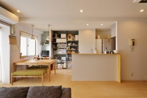 独立キッチンは、明るい性格の奥様には不向きでしたし、お子様も成長されるにつれ必要なものが増え、収納も足りていませんでいた。まずは、収納をたっぷり確保したオープンキッチンはもちろん、和室もリビングに取り込み、4人とわんちゃんがゆったり過ごせるLDKに。個室の収納やご家族共通の収納、それぞれに必要なスペースをとり、生活ゾーンには不要なものが出てこない、スッキリした空間を目指しました。
