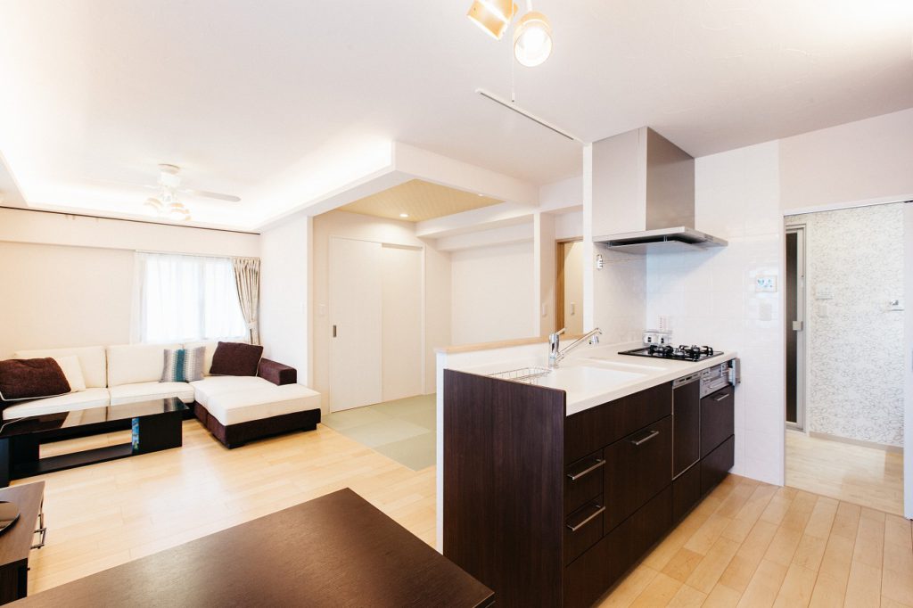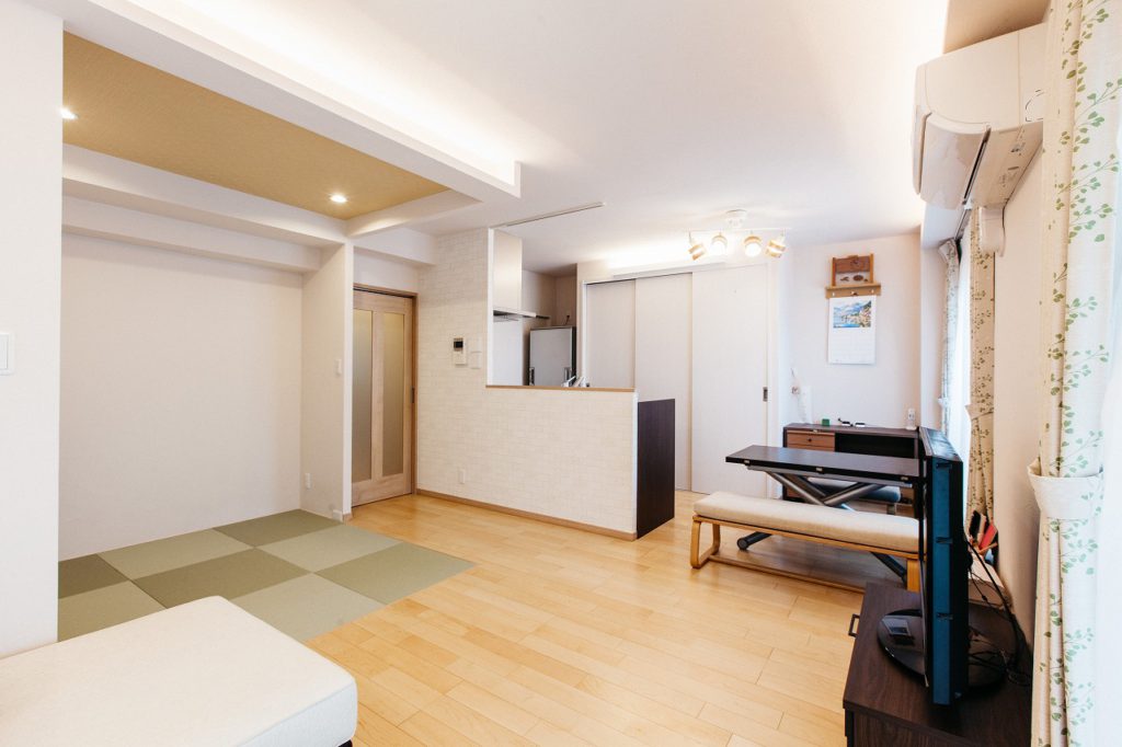 娘様が小学生に上がる頃になり、リフォームを検討。元々3年前より弊社にご相談頂いていて、資金計画が立たないとのことで、一度断念されていましたが、この度再度リフォーム計画を再開しました。一番のご要望は、キッチンにありました。孤立して狭いキッチンは、動線も悪く、また、夏場の暑さがとてもひどく扇風機を入れている状態でした。それによってまた、動線が悪くなり、家事への嫌悪感と家族とのふれあいを増やしたいとリフォームを検討されました。プランでこだわったのは、ご家族のふれあいを増やすことに注力しました。とても仲の良いご家族で、リフォーム後もそんな3人の時間を多く過ごしてほしいと思いました。具体的には、「視線が交わる回数を増やすこと」です。LDKのどこに居ても背を向けることなくお互いへ視線が向くような配置にすることで、勉強を教えているご主人と娘さんをキッチンで作業する奥さんが横目で見ていたり、奥様と娘様がキッチンで仲良く料理をしているところを、リビングでくつろぐご主人様が見て微笑んでいる。そんな空間になるよう心がけました。