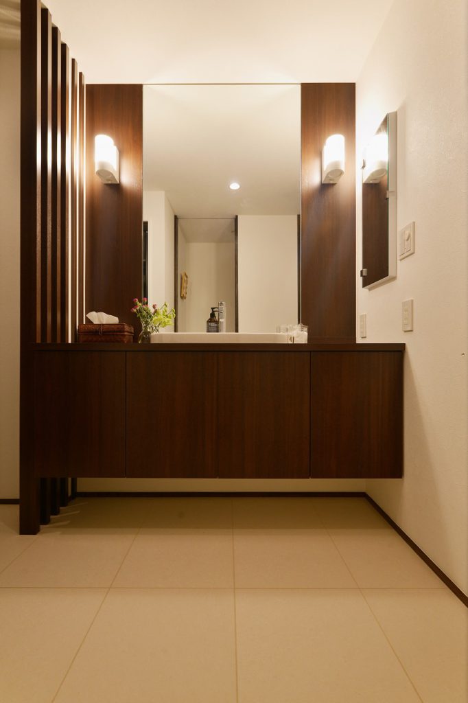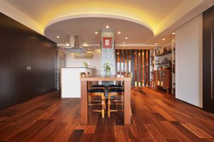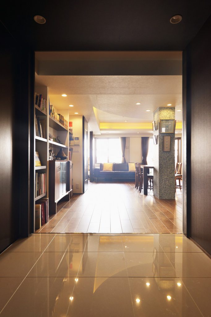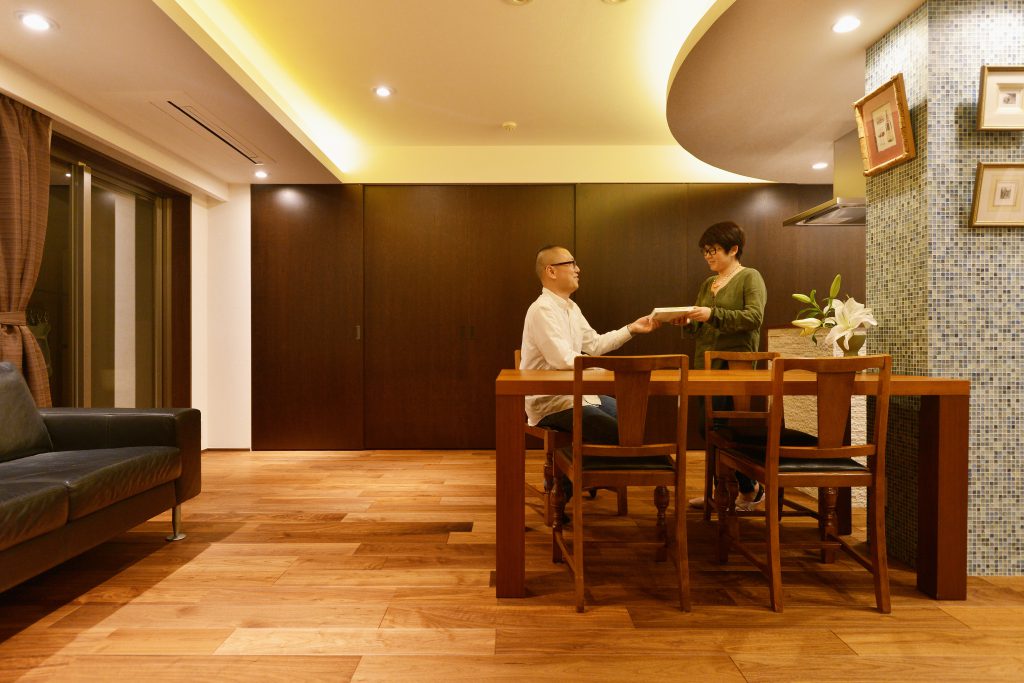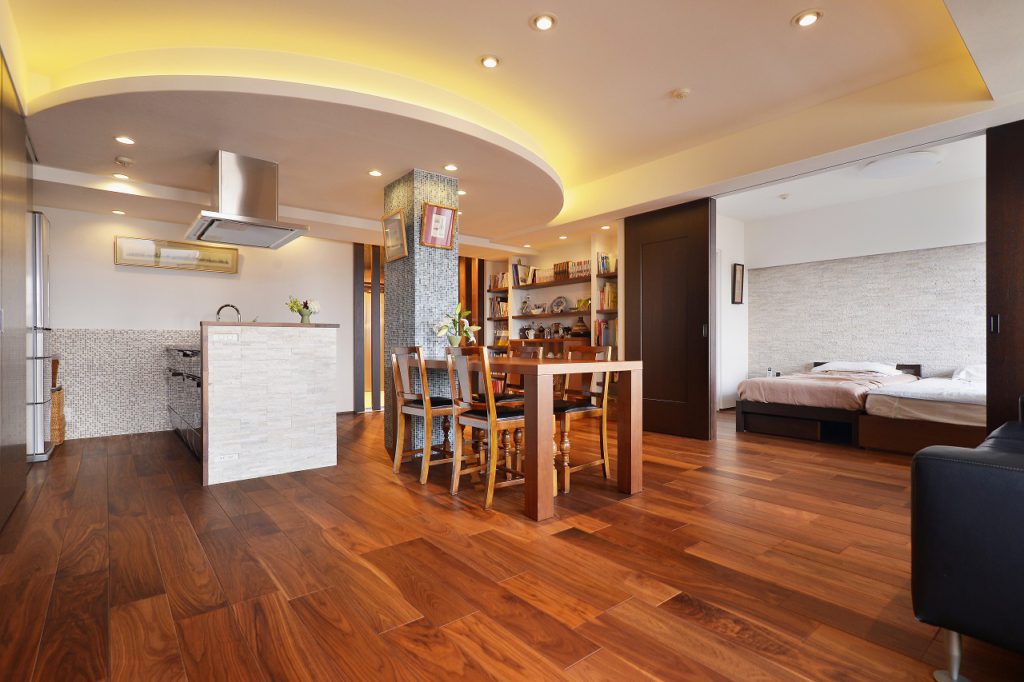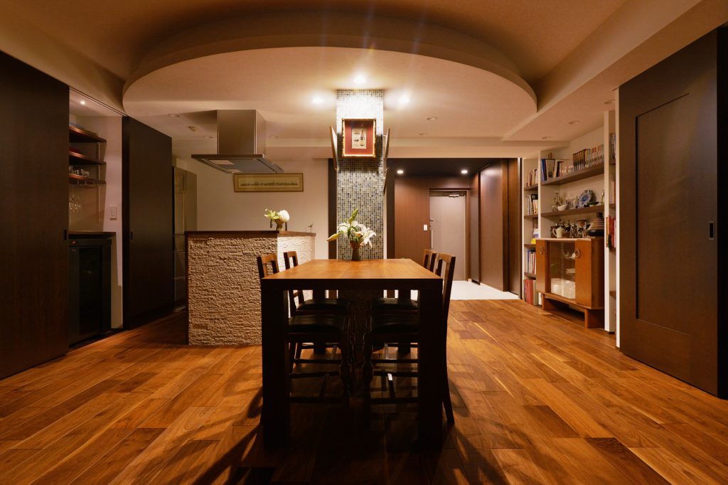 きっかけはキッチンの使い勝手や機器類の故障。もともと、マンションの面積としては2人で使うには十分な広さでした。ただ、レイアウトや仕様がお二人のライフスタイルには合っていませんでした。お二人のご希望は大好きな沖縄のリゾートホテルのような空間で暮らしたい。それを実現させる事と二人のライフスタイルに合った水廻りなどの間取りをどこに配置するのかという部分に焦点を当ててご提案いたしました。こだわりとしては、マンションではどうしても移動出来ないパイプシャフトをどう生かすのか、また、限られたスペースで広がりを感じられる空間を実現するのかという所。ベットルームとリビングを繋げる広がり、収納扉を広げる事で奥行きを感じられる広がり、玄関とリビングルームの扉は、見えなくても見えすぎてもよくないので、デザイン扉を採用しました。