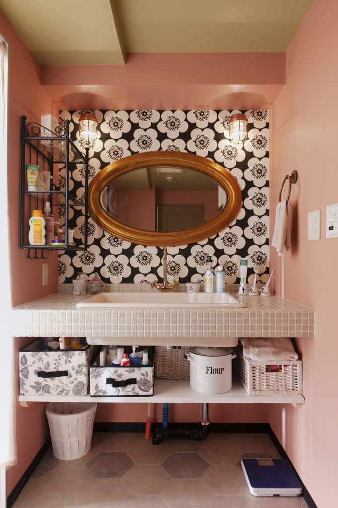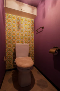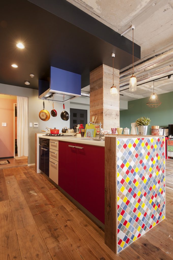 天井もコンクリート現しとして、冷たい質感と足場板など温かみのある素材とのコントラストとしています。キッチンで使われているタイルはイメージカラーを聞きながら組み合わせや色の割合を決めていったオリジナルの色合いになっています。壁紙もベースの部分でも多色使いとしていて、柄物のクロスはご自身でご手配いただいたこだわりのものです。トイレのクロスはヴィンテージもののクロスをつかっています。洗面台もオリジナルで造作。