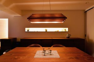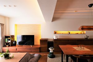 ③リビングは間接照明や床壁の素材などにこだわりたい。