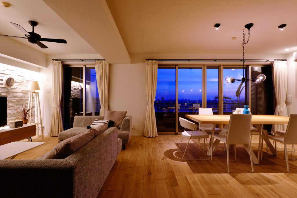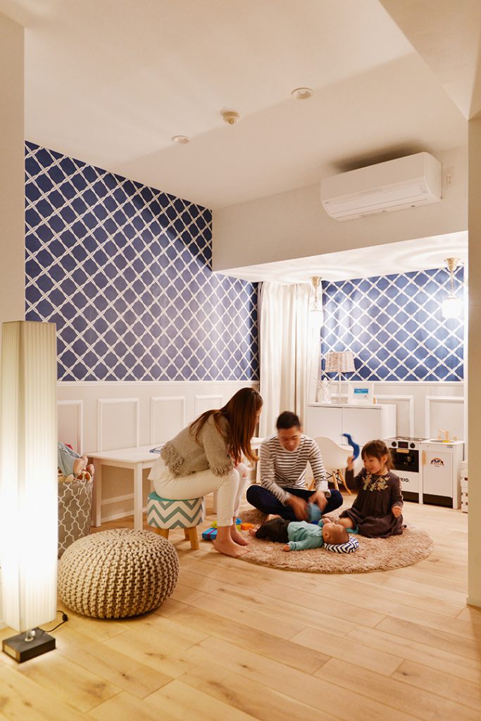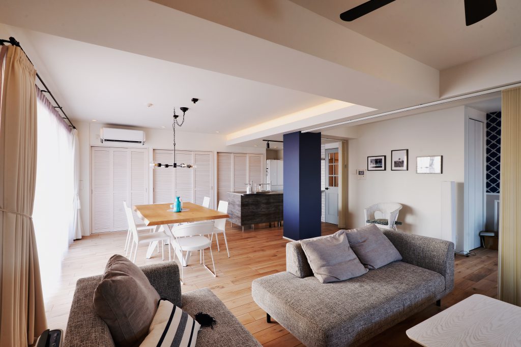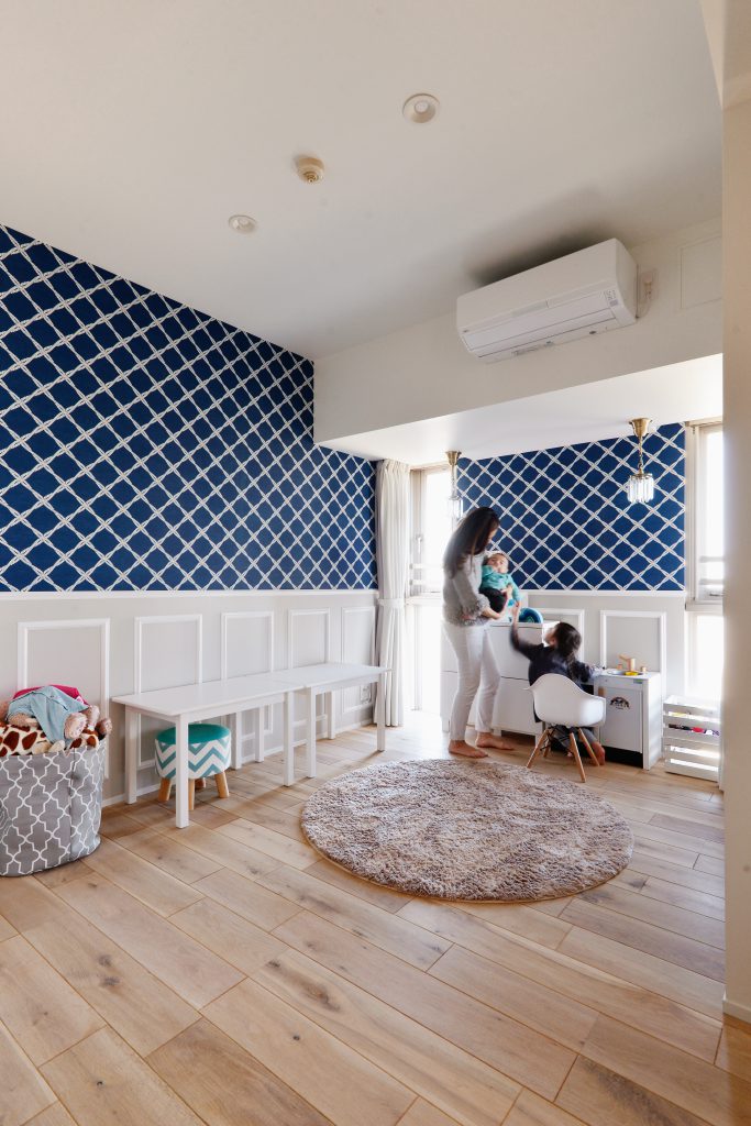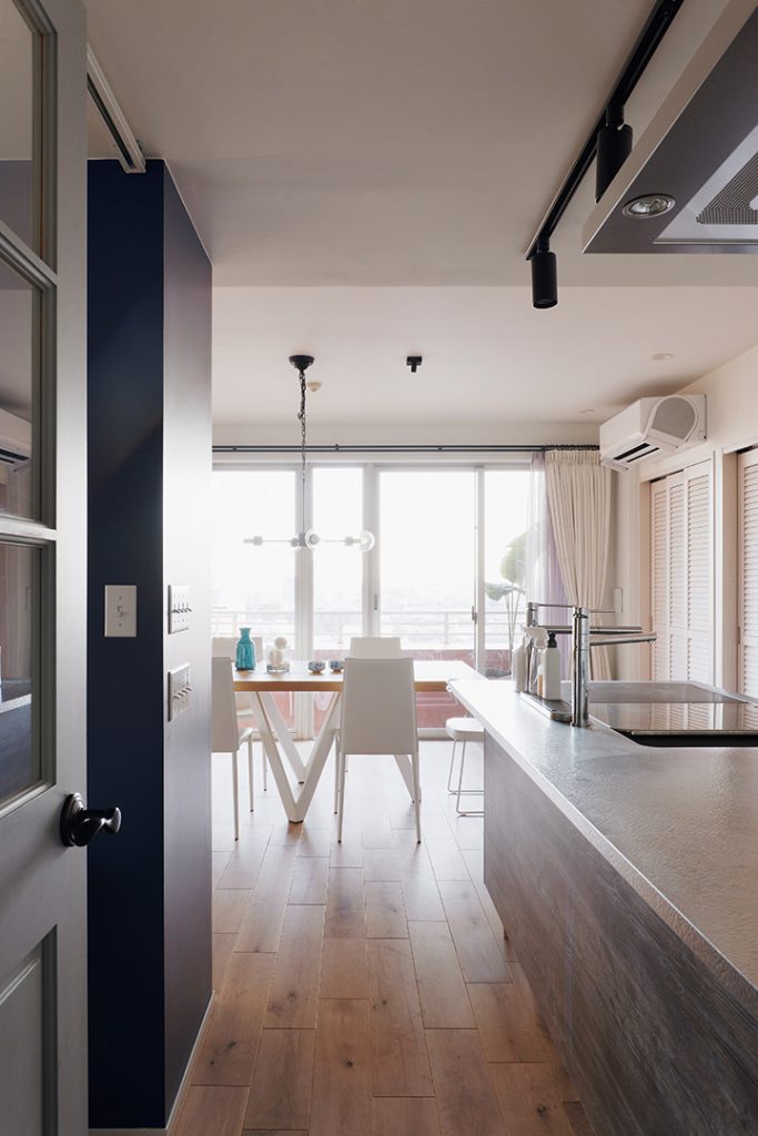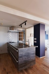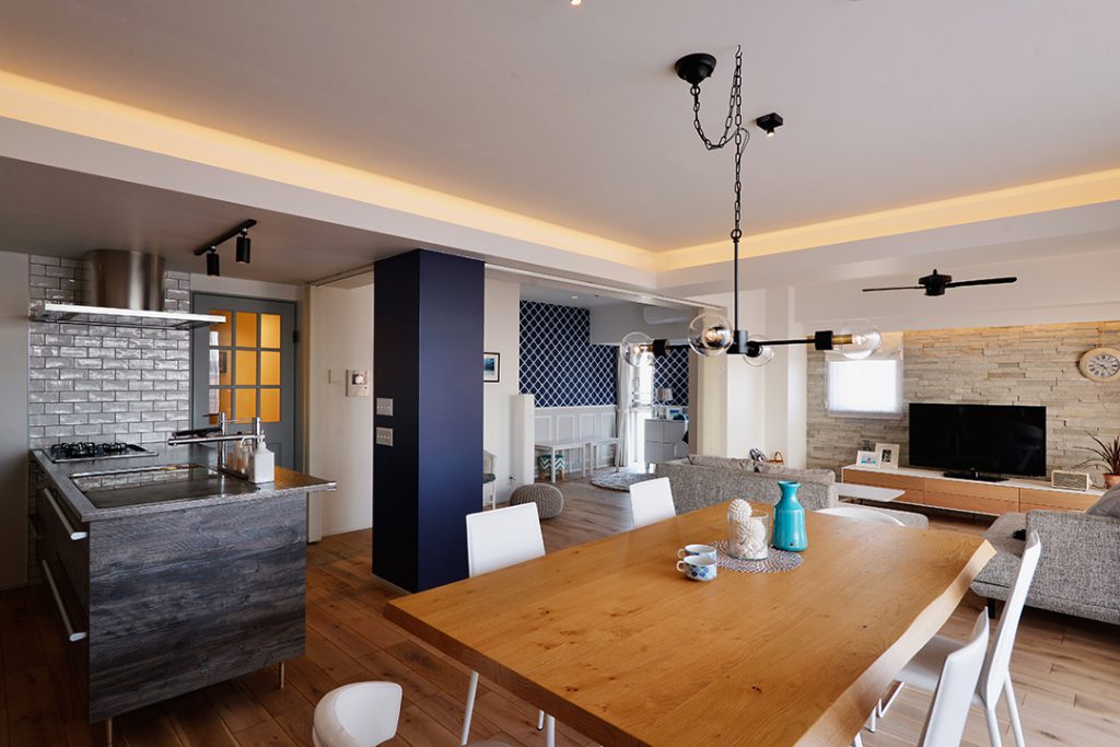 二人目のお子様のご懐妊を機に中古マンションを購入してリフォームされたM様。当初、新築もご検討されておりましたがベイブリッジも見える夜景が素敵なマンションと出会い自分たち好みにリフォームして住む事を決意したのがきっかけでした。奥様のセンスが非常に良く一つ一つの素材も好きなお色である青を基調にコーディネートしました。帰宅してリビングドアを開けると夜景が見える瞬間はまさに至福のひとときです。