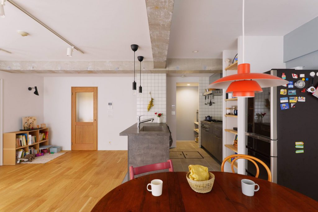 「ここに良く座るんです」工事後に久しぶりにお伺いさせて頂きました際に教えて頂いた事です。こことは配管の為に一段高くしたキッチンの床の段差部分にお嬢さんとご子息が並んで座ってお菓子を食べているところでした。お話して頂いた以外にも普段は見えないけど家族が明けた時にテンションが上がる収納のお気に入り色の塗装。ダイニングテーブルで集まったり、ソファ廻りで遊んだり、陽の光もよく入り風通しの良い明るいLDKには色んな居場所があって過ごし方がある。朗らかなN様ご家族らしいお家が出来上がったかと思います。最後まで細部にこだわりぬいたのはこんな時間を過ごされたいからかと思います。そんな思いにご助力させて頂いた時間はとても楽しかったです。今後とも何かございましたら呼んでいただけますと嬉しいです。ありがとうございました。