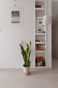 お料理関係のお仕事をされているということでキッチン廻りにこだわりました。キッチン本体だけではなく家電やゴミ箱の配置等、とにかくコンパクトなスペースで最大限の収納とベストな動線を意識しました。撮影の際に得意の手料理をご用意してくださいました。美味しいだけでなく目でも楽しめるお料理ばかりでした。御馳走様でした。