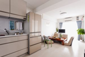 立地の良い所有していたマンションに住み替えるためリフォームを決意。ほとんど手を入れていない築40年以上の住まいでしたが、お仕事にもしている料理や家事を楽しく楽にしたい、いつも集まる友人を招待して自分の料理とおいしいお酒でもてなし、みんなでお話するのが大好きなので、やりたいことが実現できる住まいにしたいということでした。