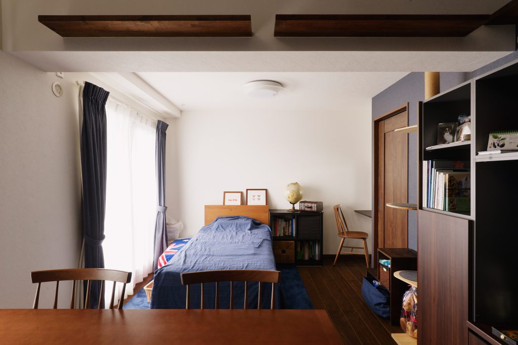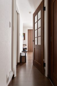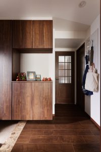 ウォールナット系の床材・建具と、紺や青といったアクセントの組み合わせが印象的なご自宅になりました。