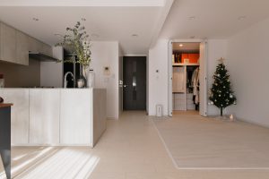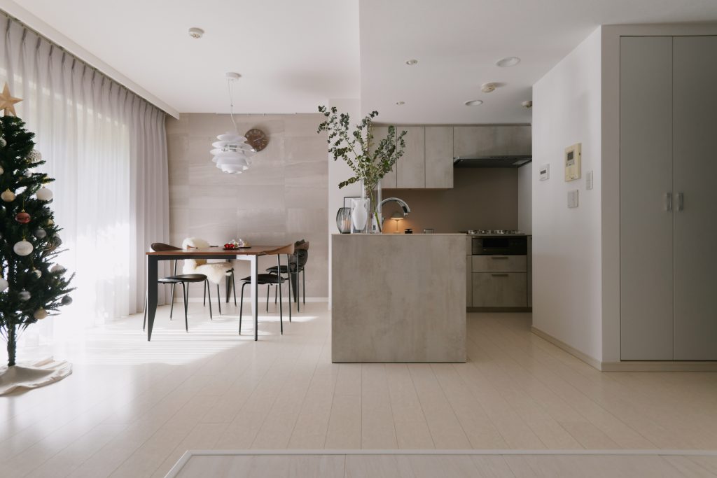 キッチンをフラット対面でOPENな雰囲気にし、LDのインテリアと馴染ませたい、とのご要望でした。