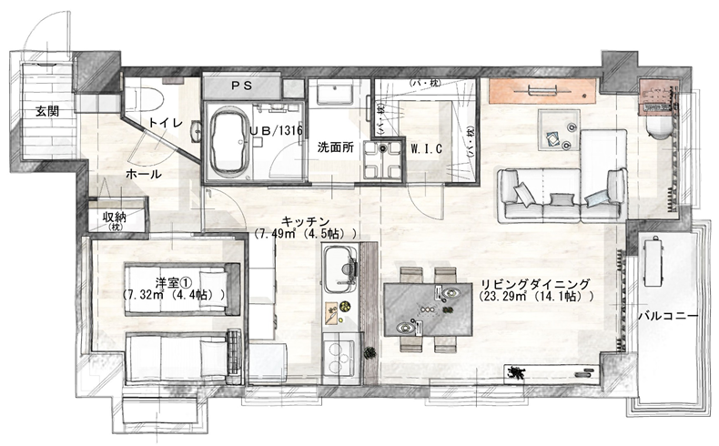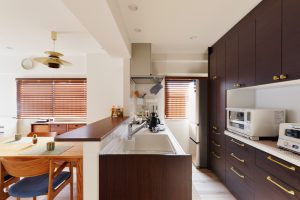 ・洗面室へもW.I.C.へもLDKからアクセスするので、キッチンで作業をしながら洗濯機の状況が把握でき、洗濯の洗う→干す→取り込むという家事動線も楽になり、散らからない部屋になるように提案した。