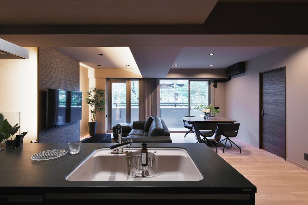 デザイン:キッチンの間仕切りを撤去し、キッチンとカップボード位置を反転しました。キッチンに立ちながらリビング内を見渡せるだけではなく、ベランダ窓越しに外が見えるようにしました