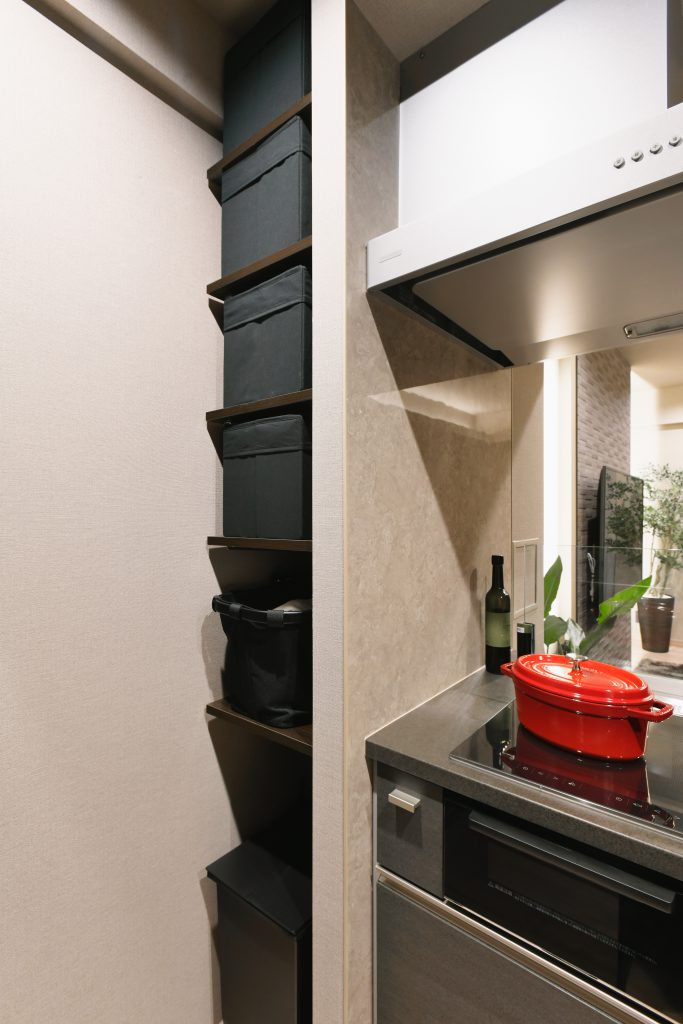 キッチンの袖壁も隠れ収納にし、生活感が見えないように工夫しました。