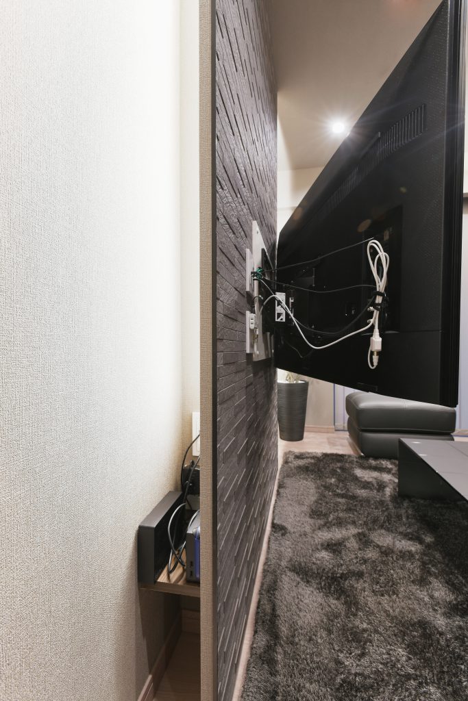 デザイン:普段は遠方に単身赴任中のご主人様が帰ってきた際に、ソファに寝転んで趣味の映画鑑賞を楽しんでもらえるようTVの設置高さ等こだわりました。また、奥様の『見た目をかっこよく』のご要望を叶えるため、配線やTV以外の機器類が見えないようにTVの壁の裏側に棚やコンセント・配線孔を設けました。
