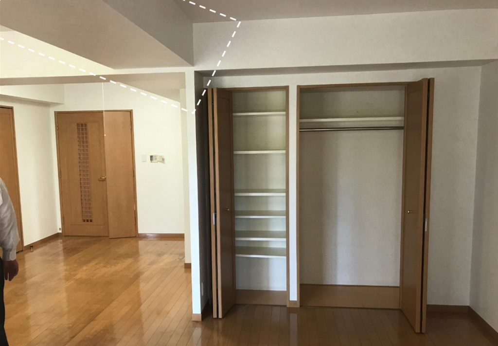 アイデア:リビングダイニングの十字梁は事前に施工担当・営業担当と現地確認したところ躯体梁と一部レンジフードのダクト梁だということが分かりました。