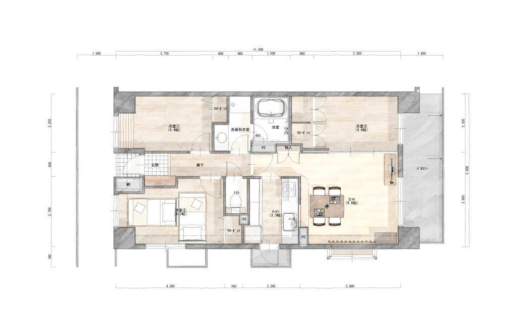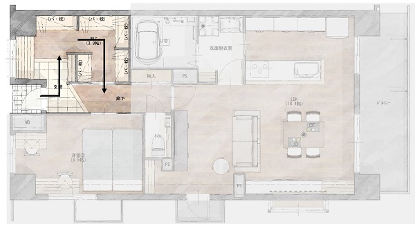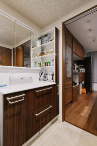 コロナ禍で生活の変化があった事もありリフォームをご検討頂き、収納やお風呂、キッチン、ワークスペースをポイントにいくつかプランを出させて頂きました。中でもキッチンの位置のかわるこちらのプランを採用頂きました。