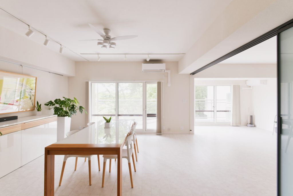デザインの観点からは、シンプルモダンなイメージにされたいということで、フローリングは白の石目調、間仕切りドア以外の建具は白系を基調にコーディネートしております。また、間仕切引戸には、黒いフレームを用いることで空間を締め、メリハリのある空間づくりを目指しました。