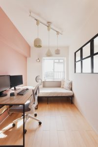 書斎部屋のアクセントのピンクは「くすみピンク」を採用しています。部屋にピンクの色味を取り入れる時、ピンク具合を考えるのが意外と難しいんです。ピンク過ぎない、淡すぎない、絶妙な「くすみピンク」の壁紙を選びました。