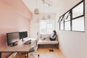 欲しかったヌックをくすみピンクのアクセントが映える空間で実現。奥行のある窓カウンターで読書をしたり、仕事をしたり。明るくて暖かい居心地のいい空間となりました。