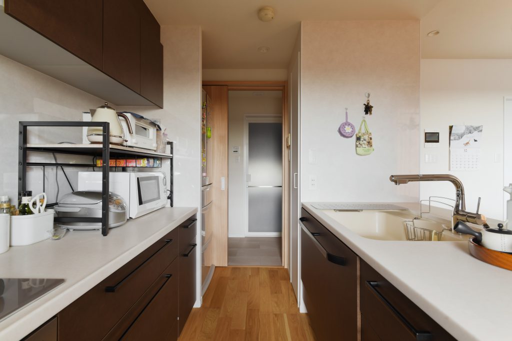 リビングからの外の景色がとてもよく、南に面した窓からは日差しが入り、冬なのに床暖房を入れているかのような暖かさを感じられます。フローリングもこだわり、朝日ウッドテックのオーク柄を選びました。洗面脱衣室、クローゼットを2wayアクセスにすることにで動線を改善し、家事の時間を短縮。ゆったりとくつろげる時間が増えました。
