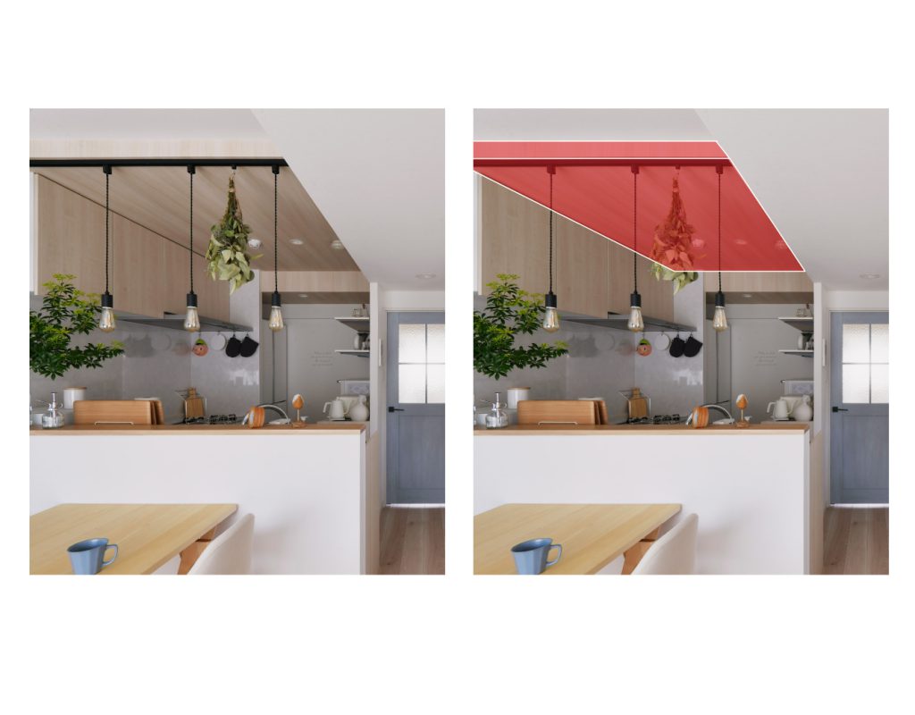 ダウンライトは天井裏にある程度のスペースが無いと取り付けることができません。Y様邸はコンクリート直の天井だったため、大工さんに天井を組んでもらい電源を廻すスペースを作りました。下がった天井は木目のクロスを貼ることでアクセントにしています。