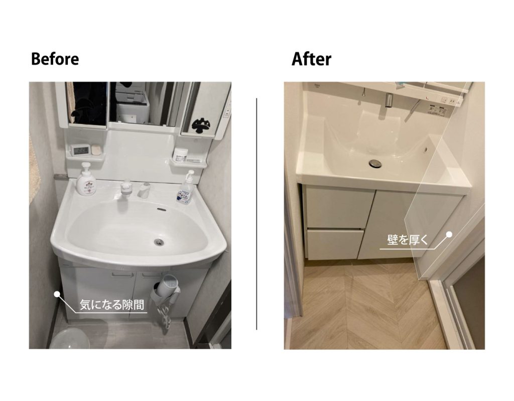 以前は洗面台の横が少しだけ空いていたことで、掃除もしづらく、収納としても使い勝手が悪い状態でした。