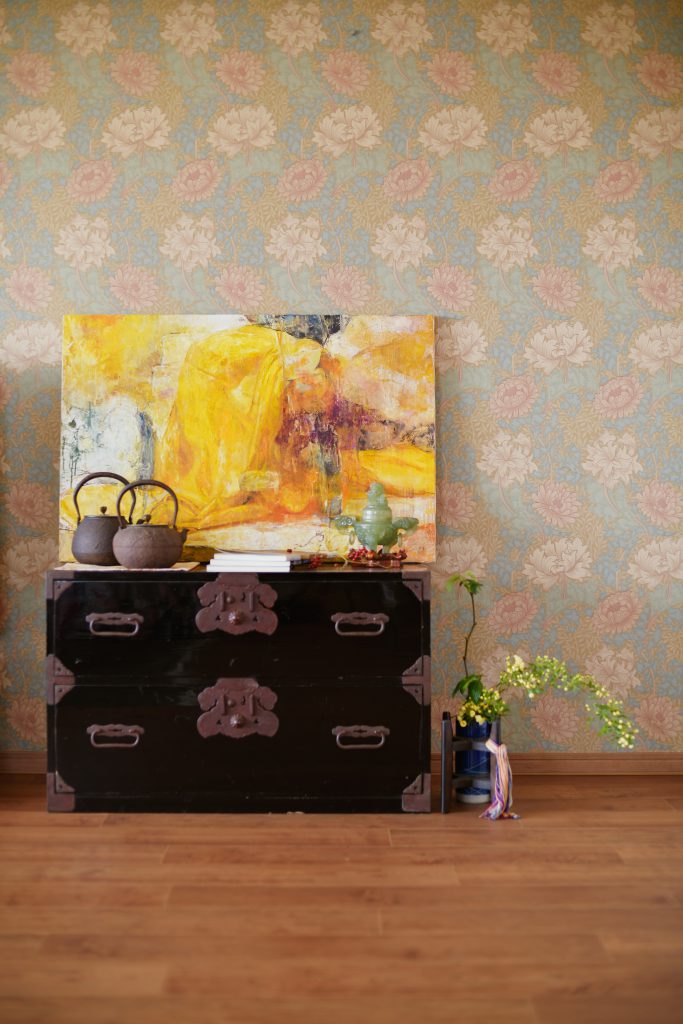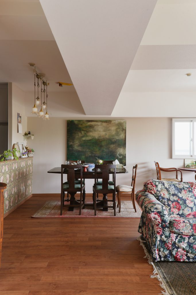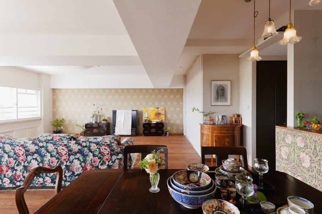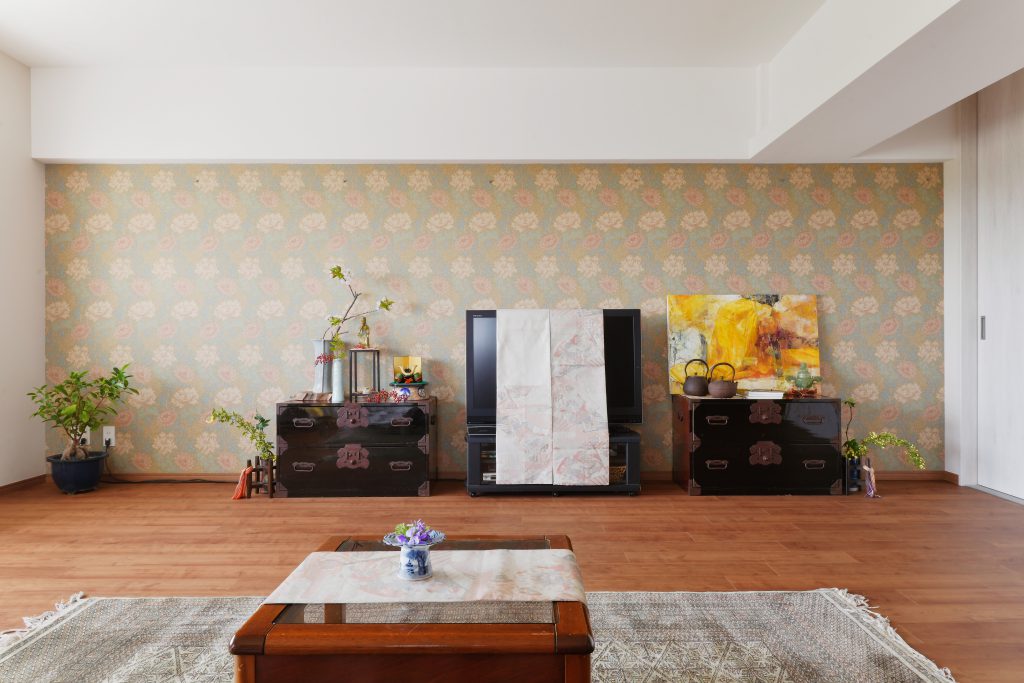 花柄の素敵なアクセントクロスと大きなソファー。色味や花柄の大きさを配慮することで、見事に空間に馴染んでいます。