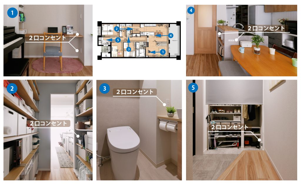 収納と合わせて考えに考え抜いたのは「コンセント」でした。後から追加することが難しい要素だからこそ、生活をイメージしながら必要になりそうなところにはコンセントを設置しています。