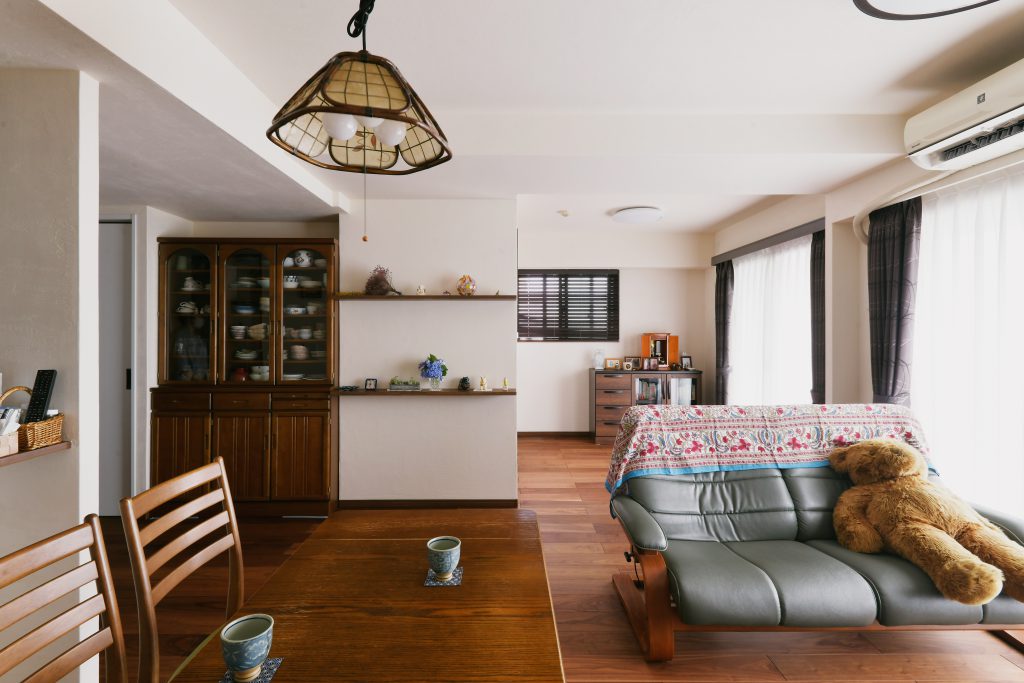 家具に合わせて間取りを考えることができるのもリノベーションの魅力です。新しい床や壁とも見事に調和して、長年そこにあったような佇まいになりました。