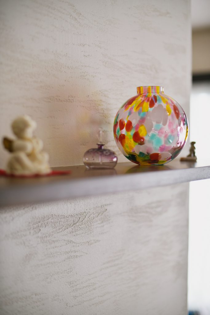 漆喰はスイス漆喰のカルクウォールという商品を選びました。壁紙とは違った優しい雰囲気を感じることができます。意匠性もさることながら、壁そのものが呼吸しているため、調湿効果があるため空気がキレイで夏場でもひんやりととても快適です。