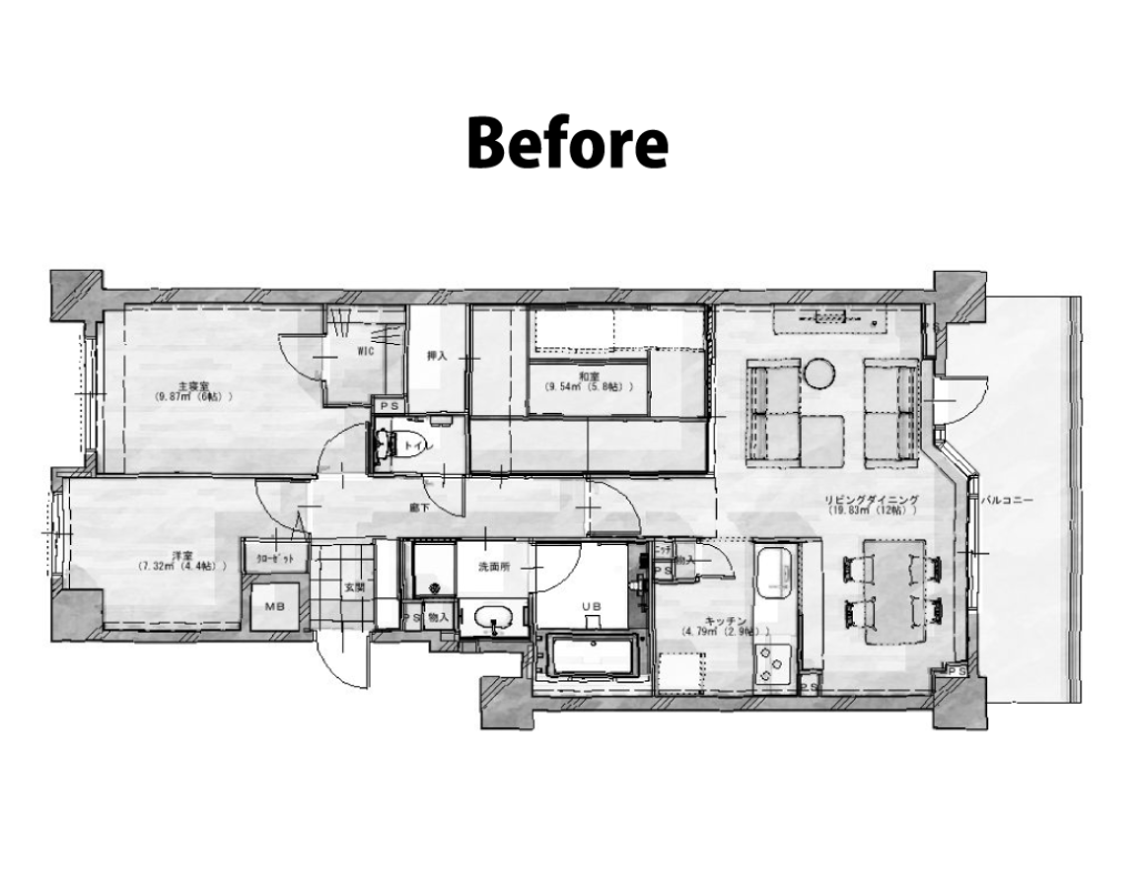 築年数が経過している団地ということもあり、水廻りの配管スペースの制約上簡単にはキッチンを移設することが難しい造りでした。元々は壁付のキッチン。閉鎖感があり、憧れの対面キッチンにはどうやったらできるかと、リフォームの計画を進めました。