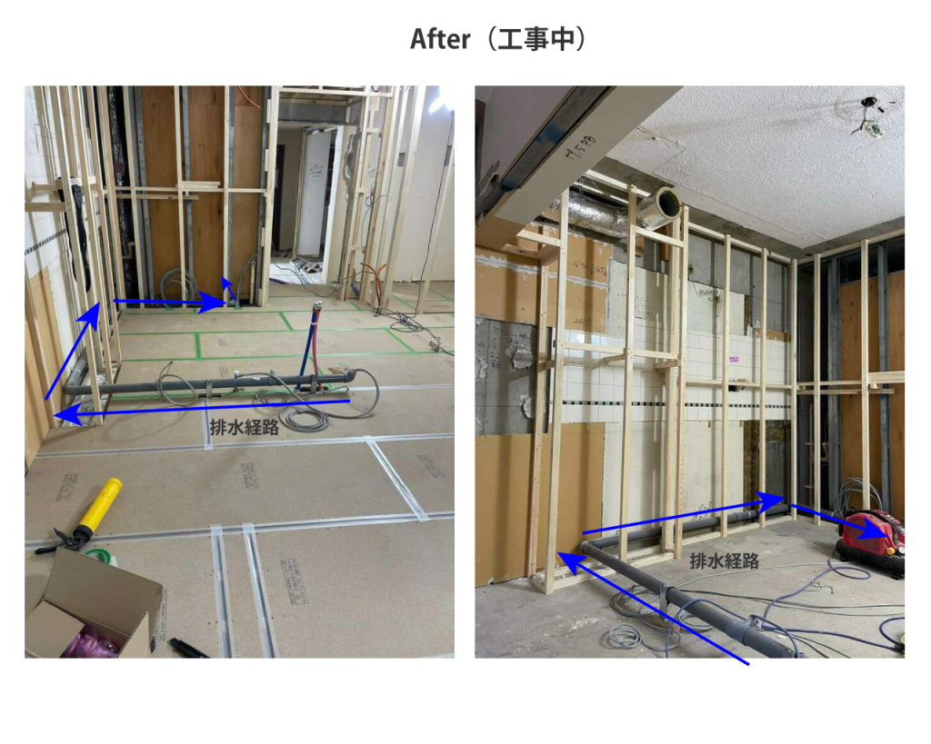 壁の中を緩やかに勾配をつけながら曲げて、洗面室側の排水へ合流させています。経路が長くなる分、しっかり流れるように勾配をつけています。