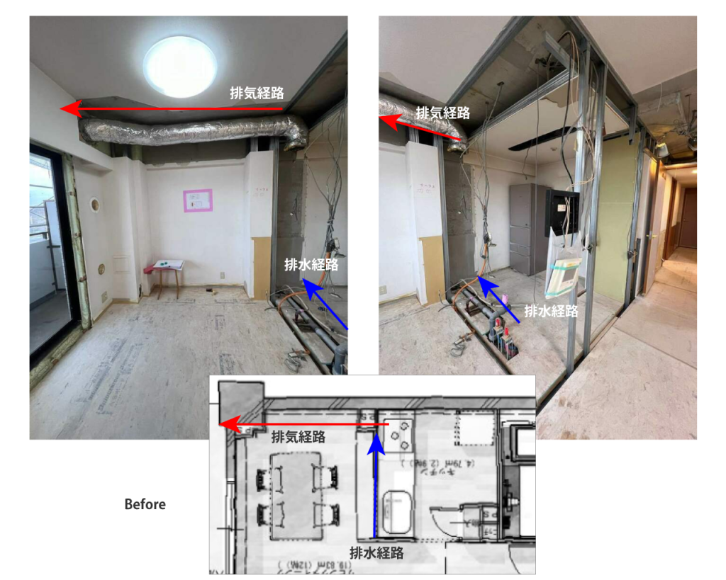 キッチンを移動するということは、排気経路を変えること。排気の出口はリノベーションで変えられないので、移動先のキッチンからどうやって既存の排気口まで持っていくか。という工夫が必要になります。