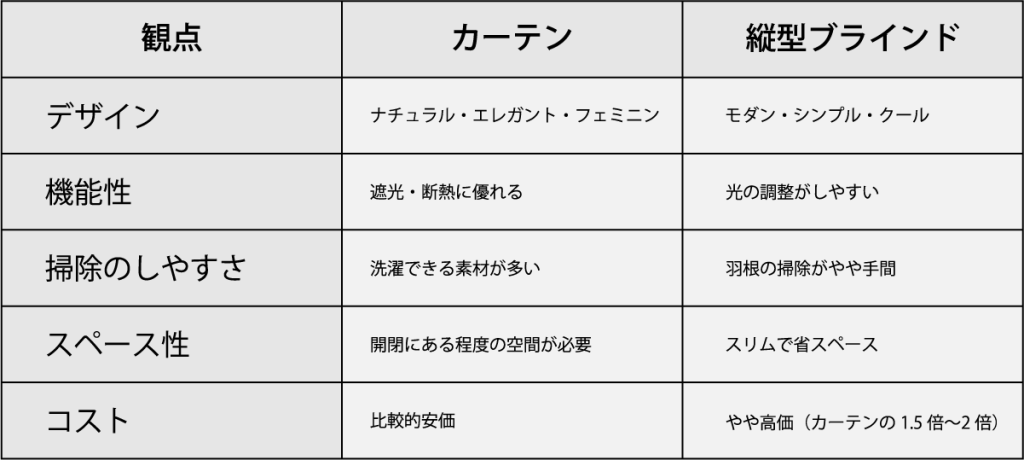 カーテンは定期的な洗濯が可能ですが、縦型ブラインドは、1枚1枚の羽根が独立した造りのため、掃除が手間になることもあります。メンテナンスのしやすさも選択基準になります。