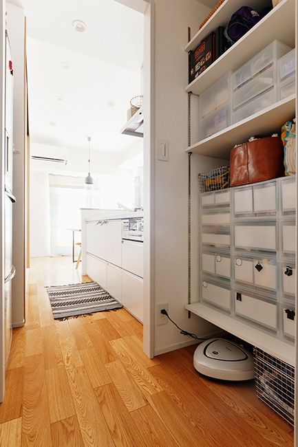 収納は効率を上げるだけでなく見た目も美しくする事ができます。よく使用するものは目線の高さに収納すると便利です。吊戸棚がユニットになっていて、棚ごと引き下げて使えるものは、椅子を使わなくても中身を全て見て取ることが出来、とても便利です。