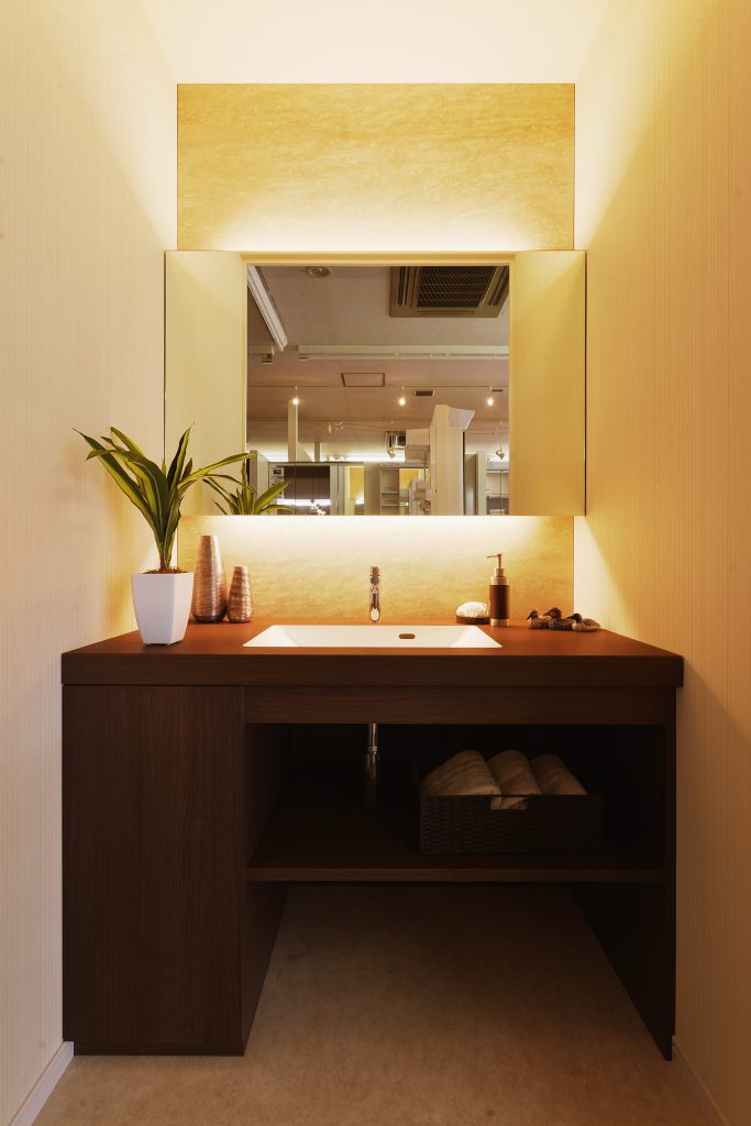 歯磨き・手洗いの他に、化粧や洗顔・洗髪等、身支度を整えるための機能を持っているものです。収納や小物置き場、コンセント、鏡面台、蛇口がシャワータイプになっていたりと、使いやすいように工夫されています。