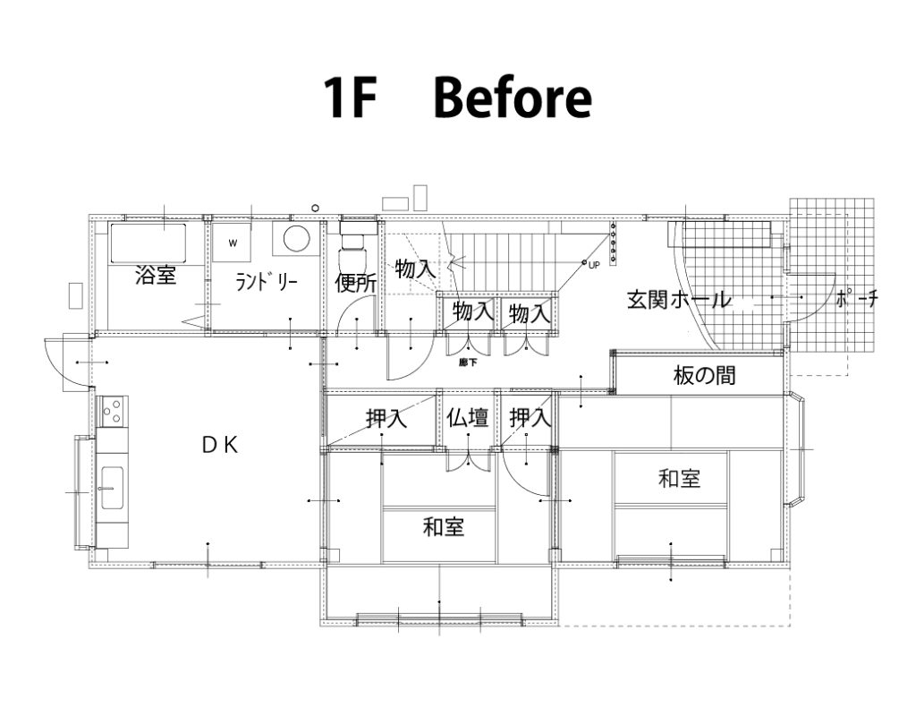 パントリー・キッチン・ランドリー空間と一直線に続く間取りにリノベーションしたこちらの事例。