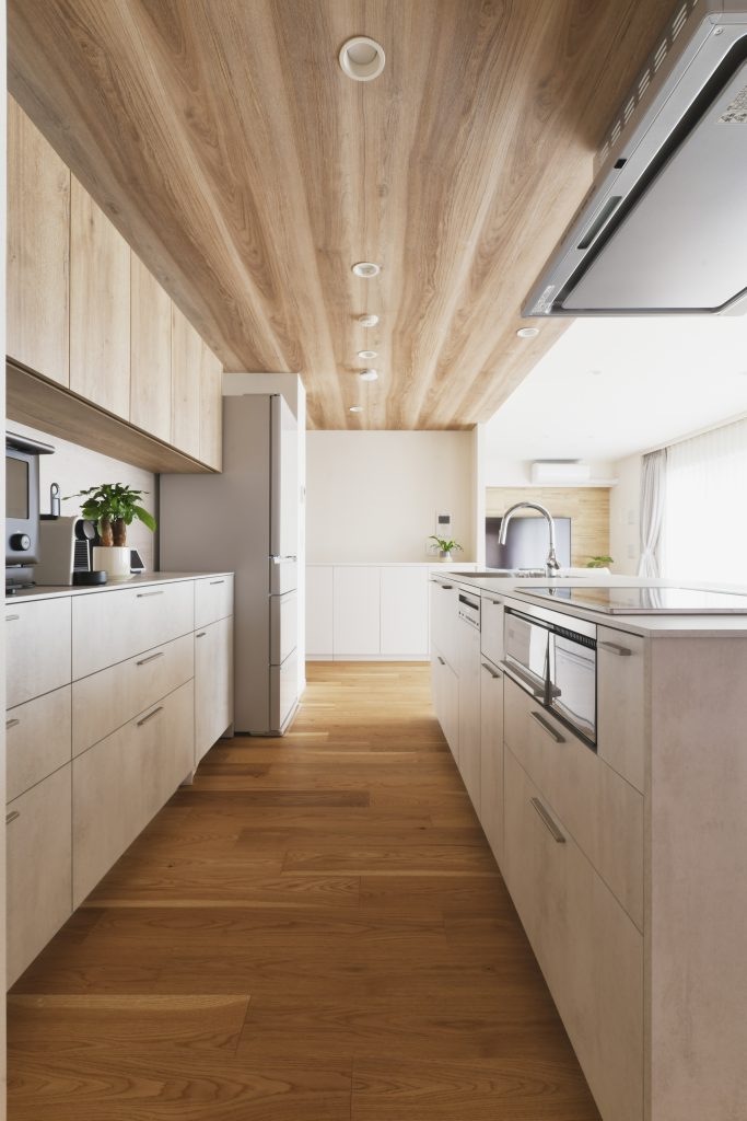 この事例は突板フローリングなので安心ですが、無垢材のフローリングの場合は水に弱いので、キッチンの床に採用する場合は注意が必要です。