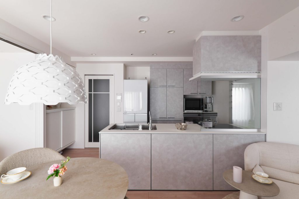 真っ白にならないように、グレーやベージュといったトーンを織り込むことで、白を基調としたおしゃれな空間になりました。