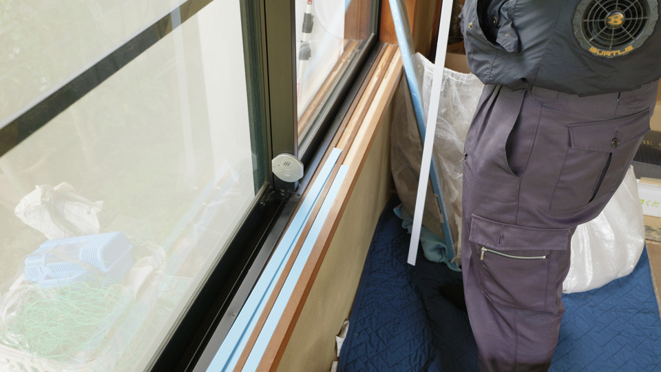 窓の状態を確認し、内窓を設置するための「樹脂製の専用枠」を取り付けます。